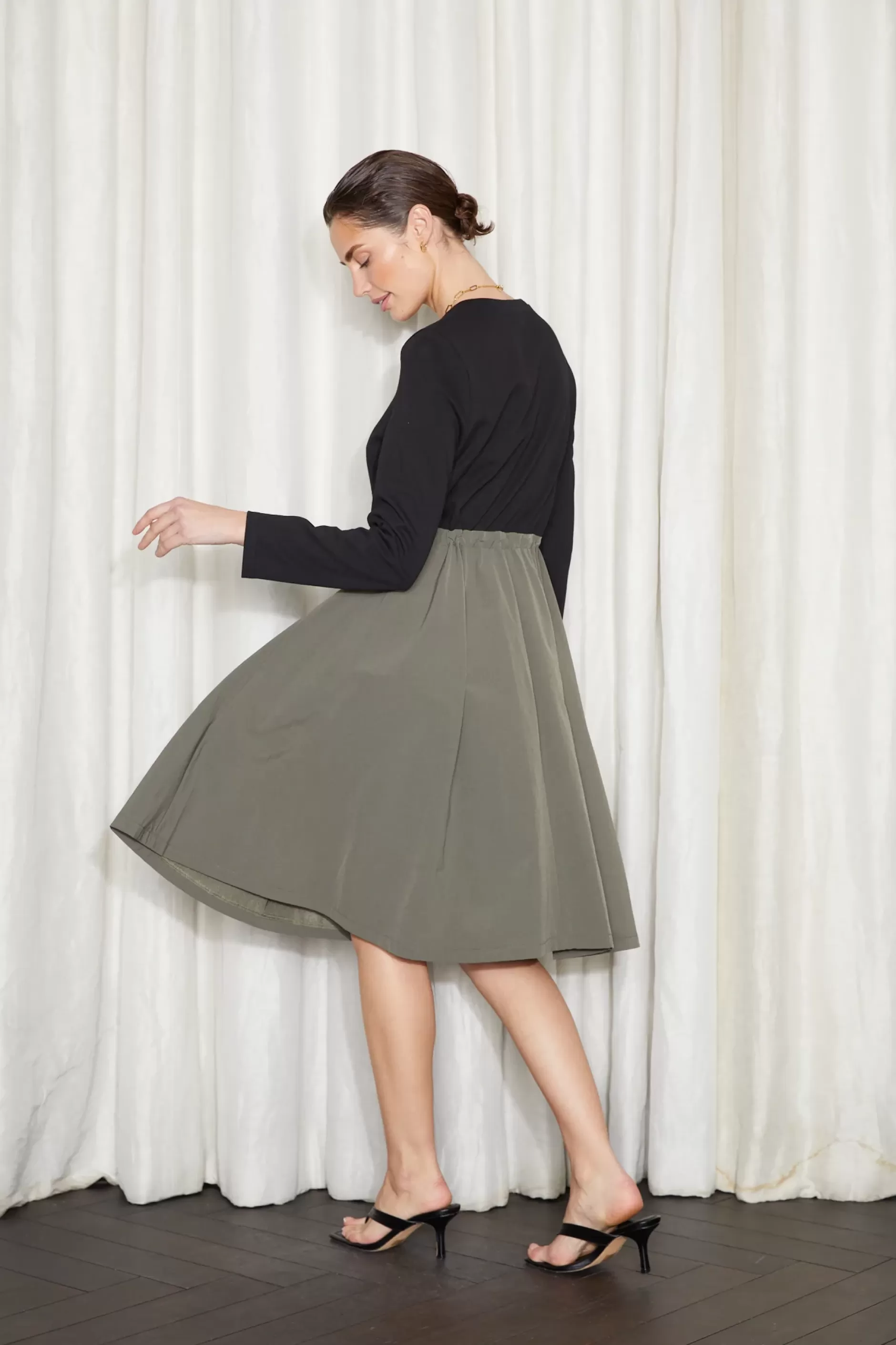 The Areska dress has a unique design that gives the appearance of separate. It is crafted from a combination of crisp cotton crunet for the long-sleeve top and a contrasting, flowy skirt. The drawstrings help define the dress shape and add a utilitarian edge, while the side welt pocket with flaps adds functionality.
