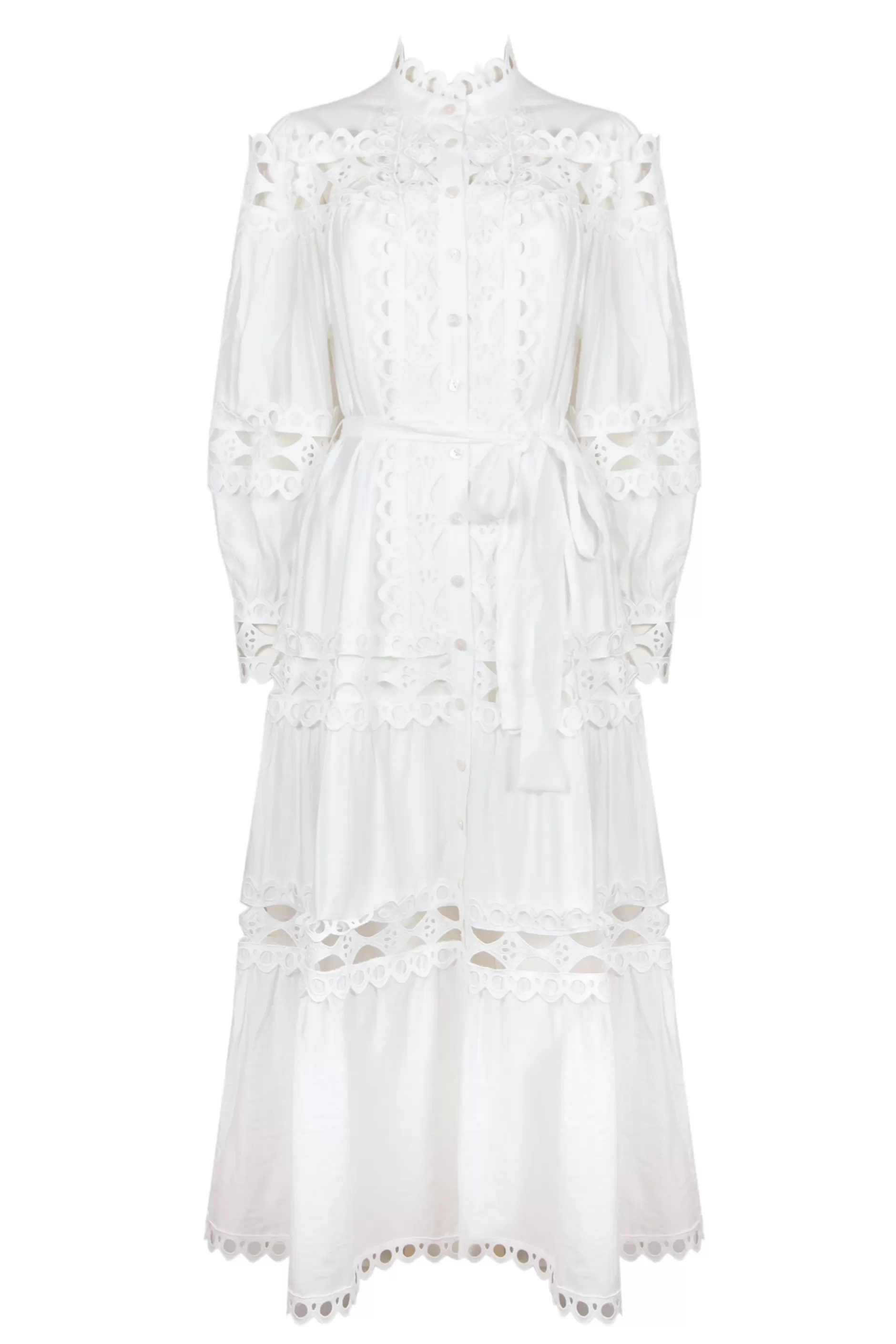 The BOHIEM DRESS WHITE is a sophisticated and versatile addition to any wardrobe. With delicate embroidery and stylish cut out details, this midi dress can easily transition from casual to formal occasions. Perfect for dressing up or down, this garment offers endless possibilities for effortless and elegant looks.