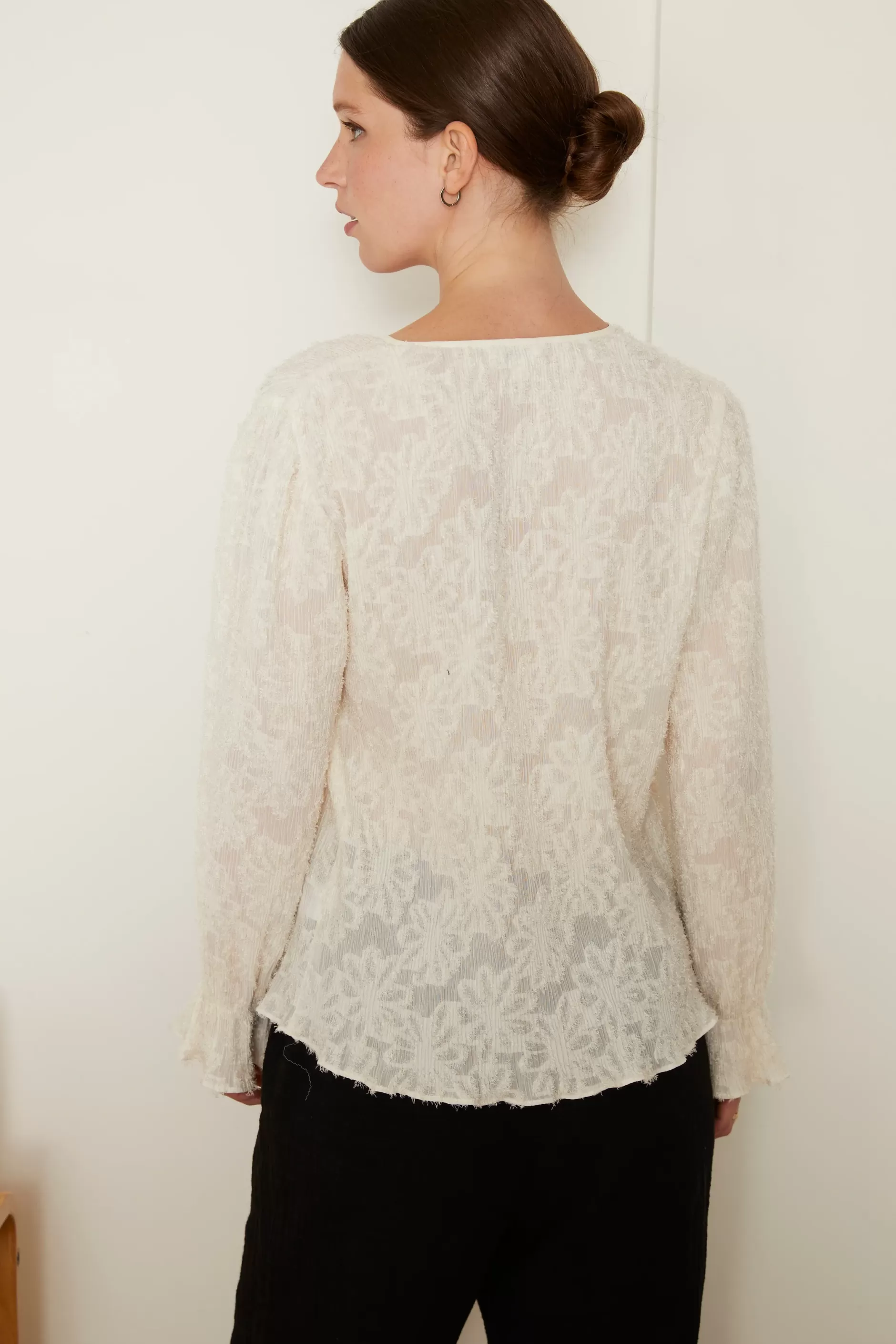 Designed with a sheer embroidery of flowers, the Kielo blouse will be your new muse! A delicate lace tie adds detail to the design and compliments the flared cuffs.